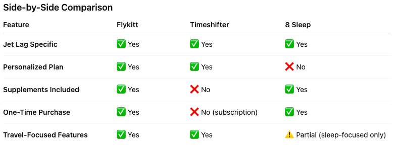 Today, three solutions stand out: Flykitt, Timeshifter, and 8 Sleep. Each promises to help you beat jet lag, but they take very different approaches.